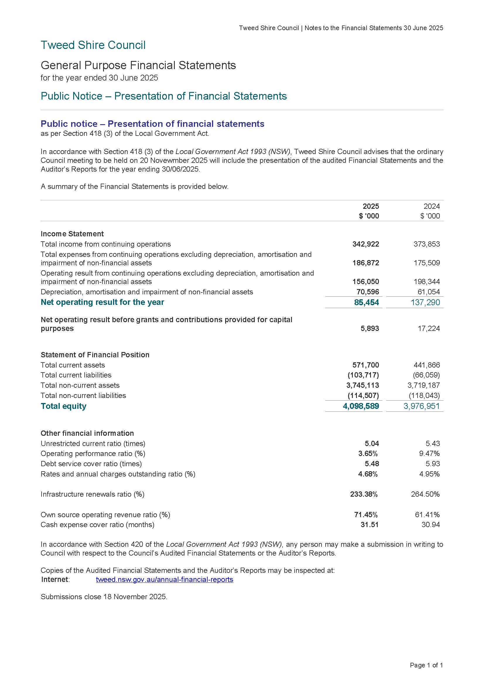 • Mail: Financial Statements 2024-25, Manager Financial Services Gary Boyd, Tweed Shire Council, PO Box 816 MURWILLUMBAH NSW 2484
